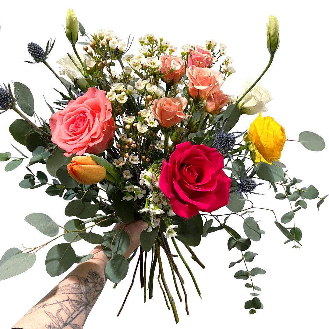 we're offering fresh, vibrant blooms in three different size options — big bouquets, small bouquets, and mini bud vases — for pickup on February 13th & 14th.