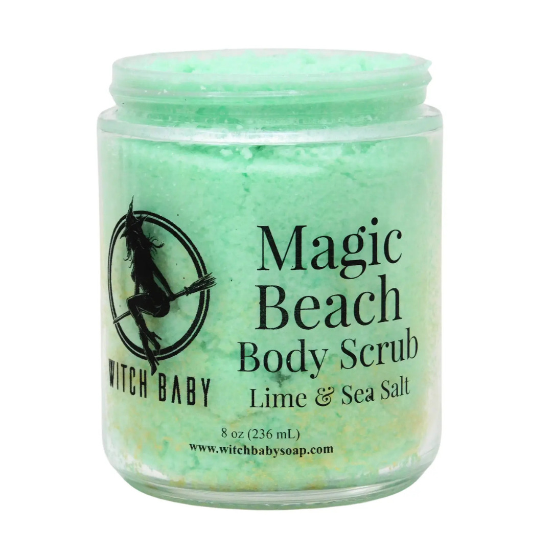Witch Baby Soap's Magic Beach is a sea witch’s citrus-soaked day dream. A sweet playful blend of zesty lime, sea spray, and agave nectar invigorate the senses. Sea salt and natural clay give this body scrub a deep detoxifying exfoliation, while gold glitter leaves your mermaid skin glistening. Slippery when wet!