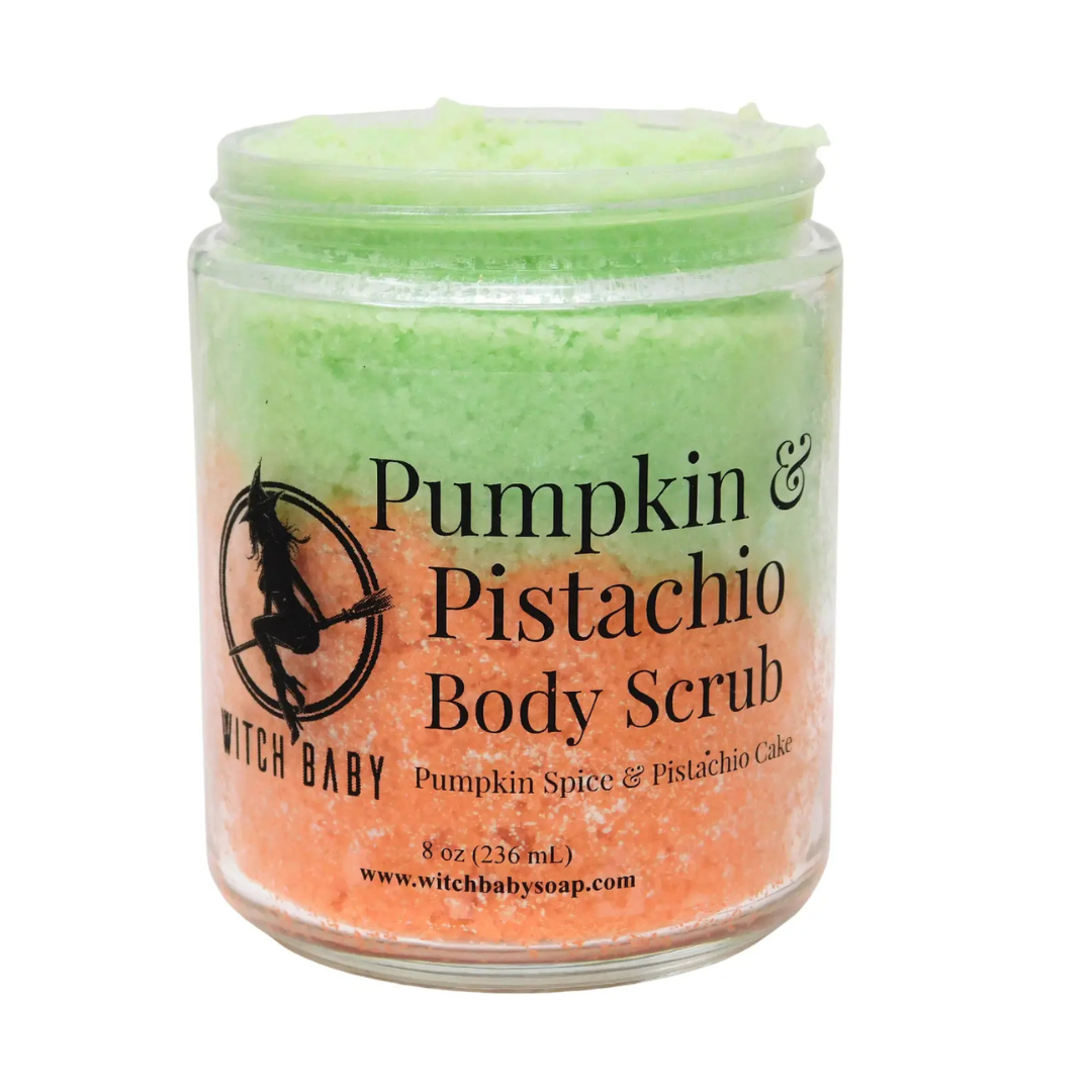 Witch Baby Soap's Pumpkin & Pistachio is a spooky sweet love letter to Halloween with a blend of pumpkin, pistachio, maple, and candy corn. This cavity-inducing body scrub is made with deeply nourishing shea butter, exfoliating sea salt, and pistachio green biodegradable glitter.